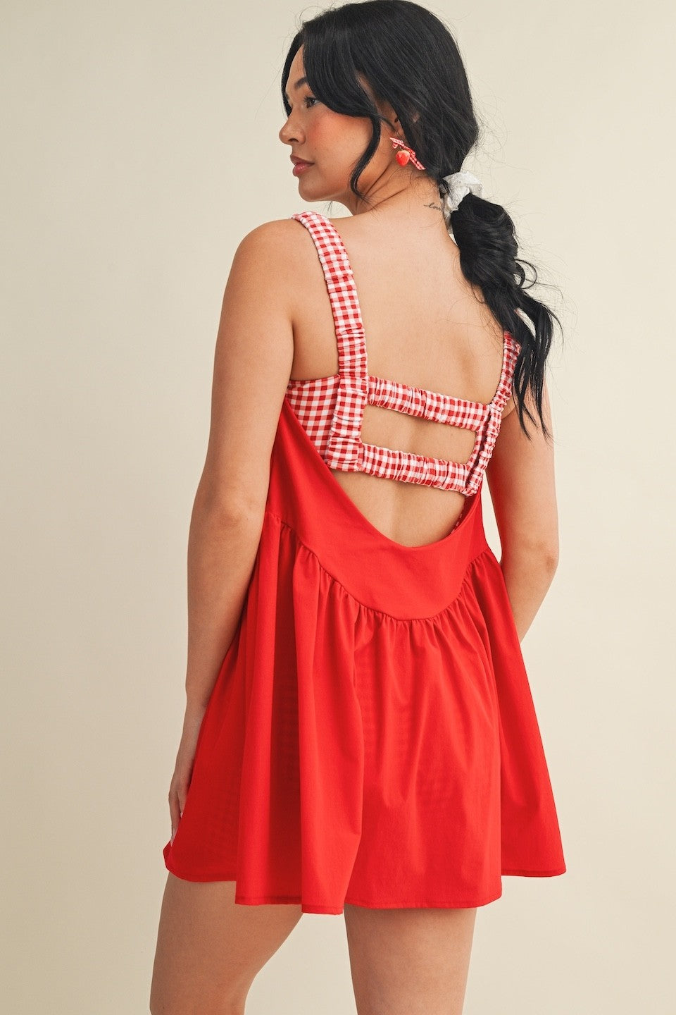 Fun, flirty, and designed for effortless movement. This double layered play dress features a breezy, layered silhouette with a built-in gingham print bra and shorts, providing coverage, support, and playful style in one piece. Crafted from lightweight, breathable fabric, it is perfect for active days, casual outings, or athleisure styling.