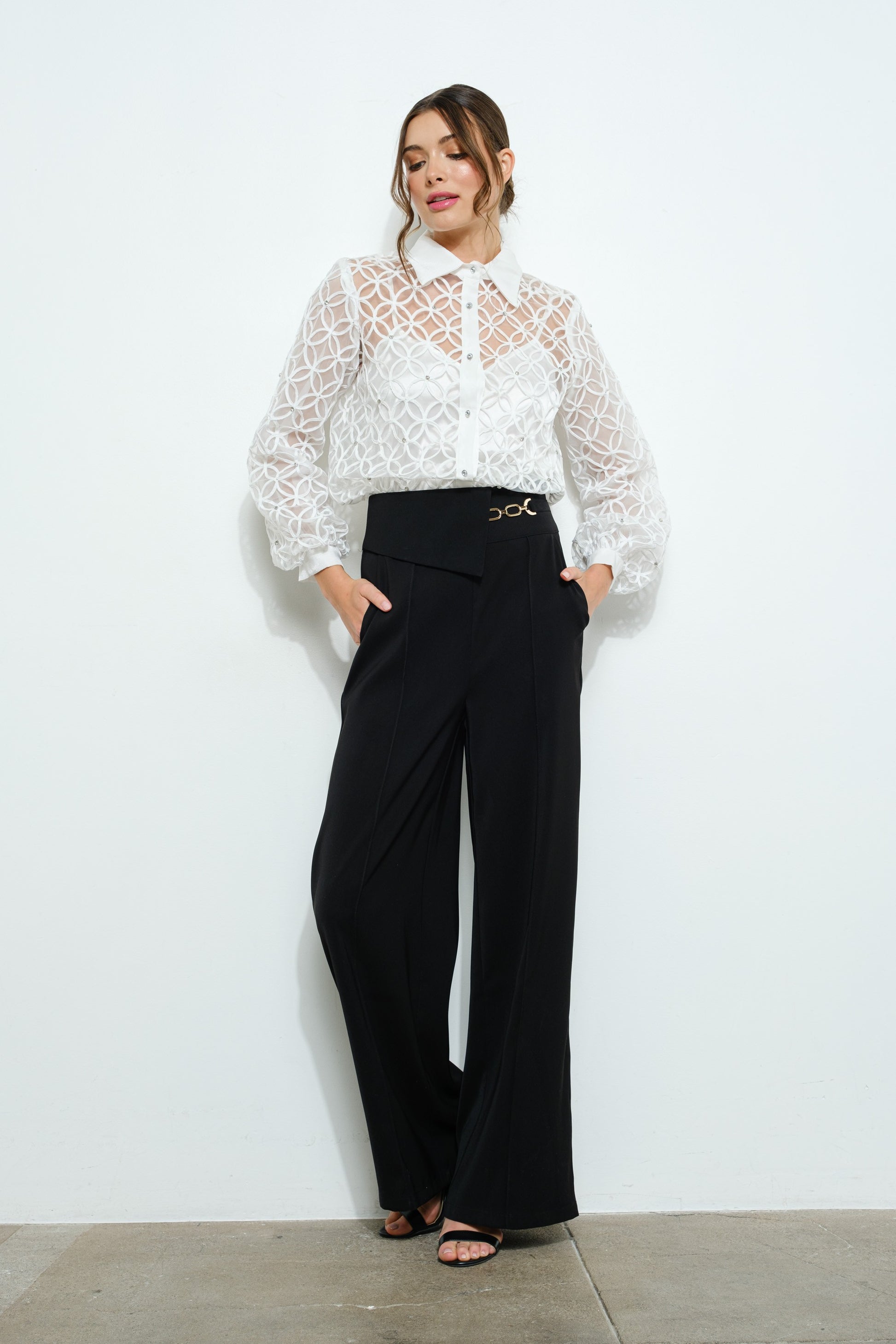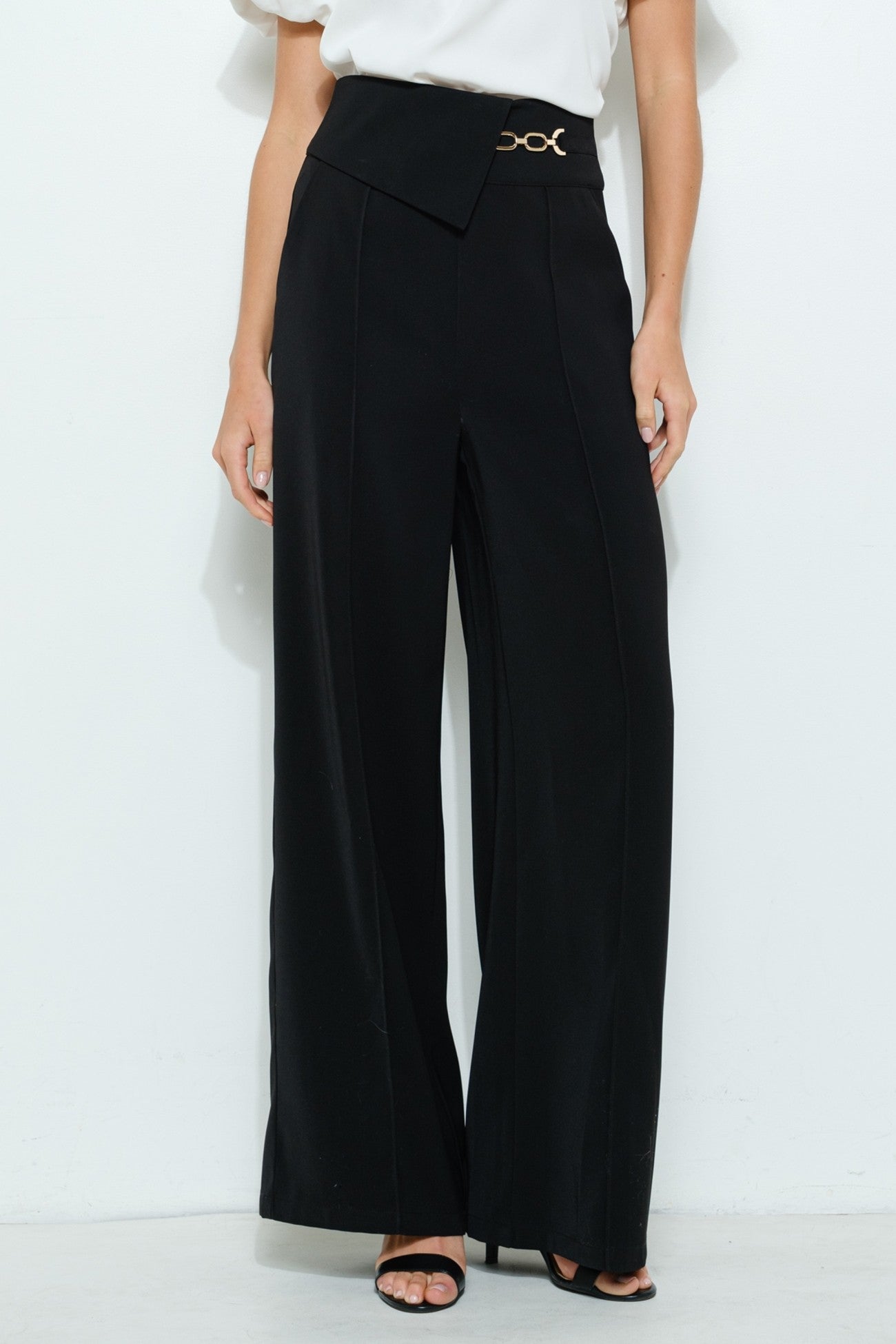 The Caitlyn Wide Leg Pants combine a high waist and wide-leg silhouette for a flattering, elongating fit. Featuring a modern flap waistband with gold chain accents and practical side pockets, they’re perfect for elevating formal, office, or casual looks with cool confidence.