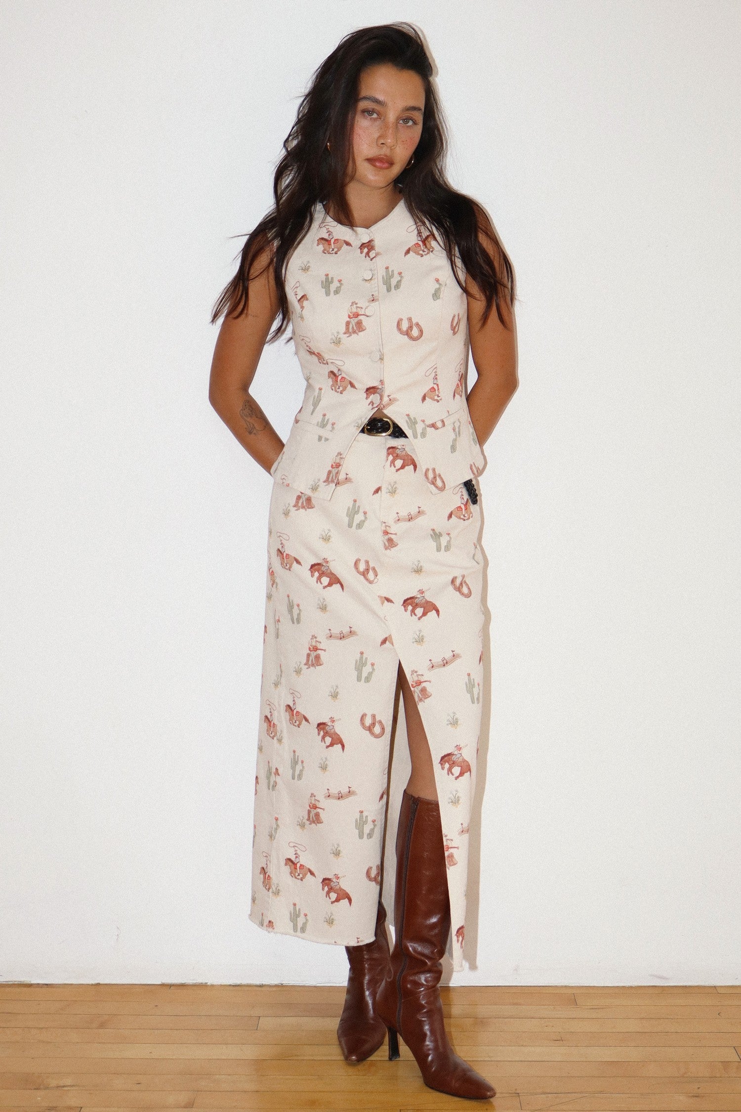 Add a bold touch to your look with the Lucky Girl Western Skirt. This flowing maxi skirt features a striking western print and a front slit for effortless style and comfort.