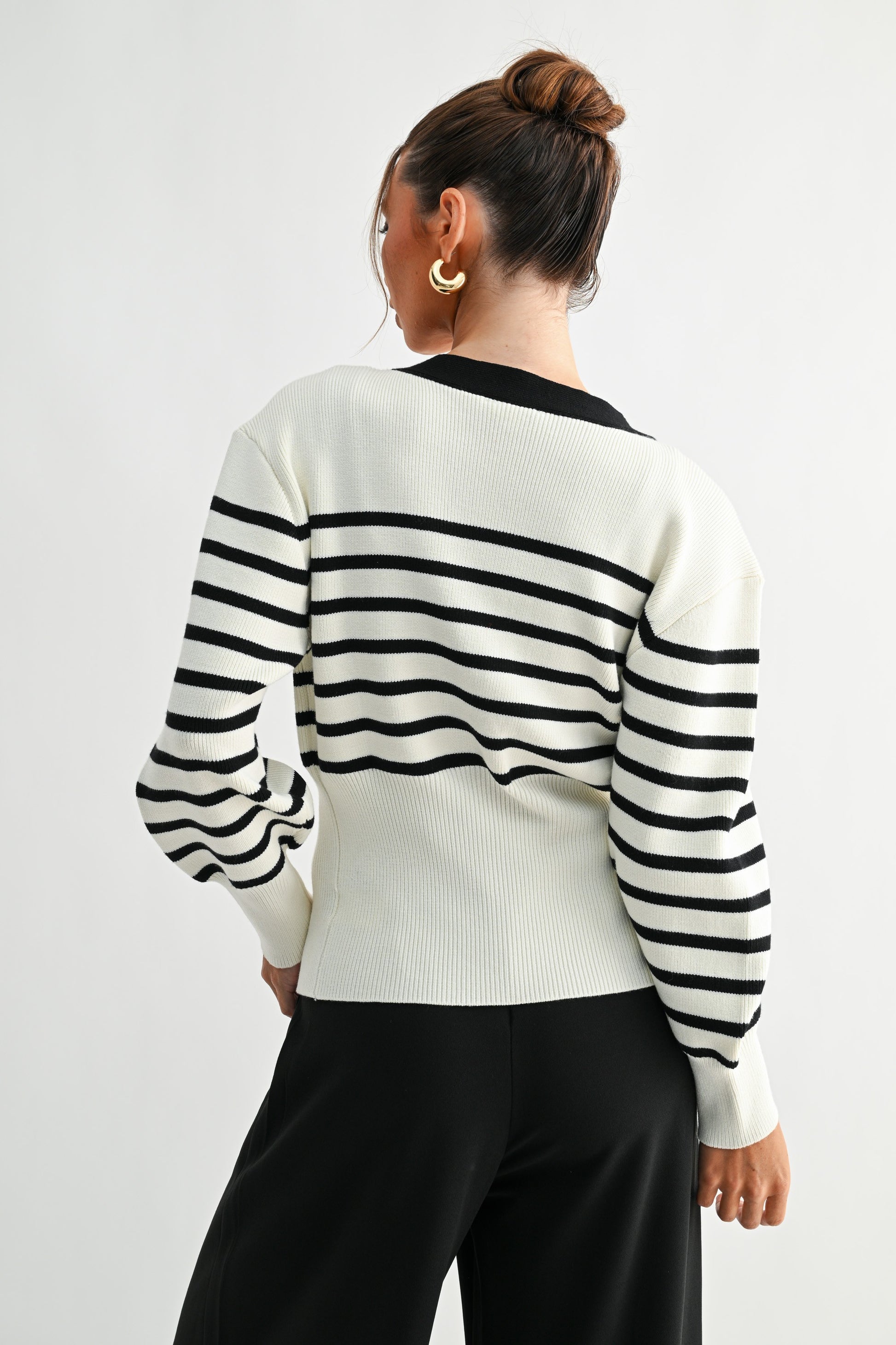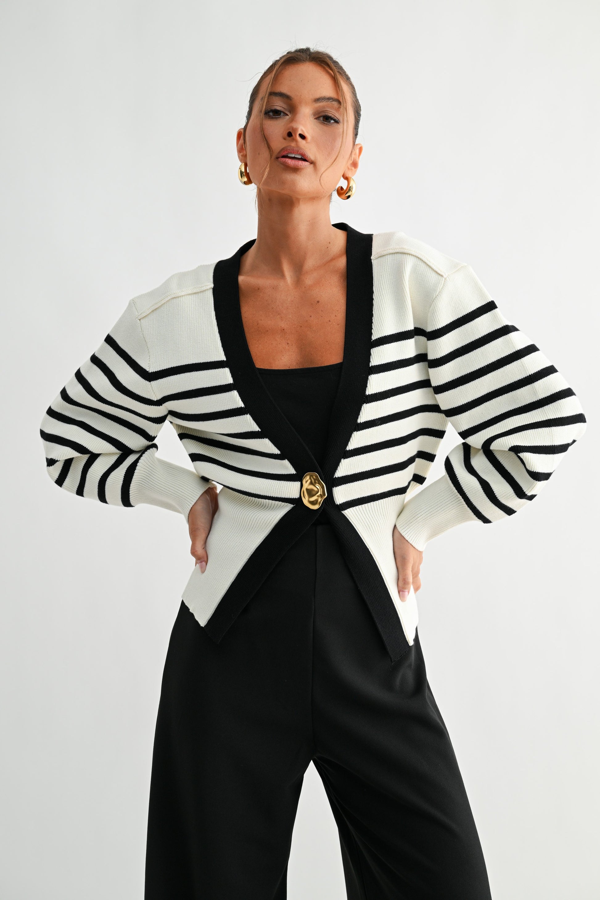 A refined take on casual layering, this cardigan features a deep V-neckline and voluminous sleeves for a soft yet structured silhouette. The front is accented with a bold, sculptural gold-tone button that serves as a decorative focal point, while the cardigan remains open for effortless styling. Ribbed detailing along the hem, cuffs, and neckline enhances its tailored fit while maintaining comfort.