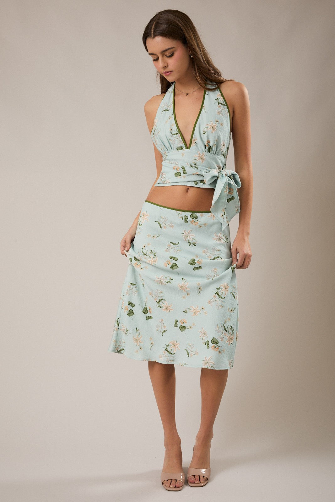 Escape into effortless elegance with the Sally Halter Top, a romantic piece designed to transport you to sun-drenched destinations. This floral halter features a graceful neckline and adjustable waist tie that flatters every silhouette, while soft, romantic hues evoke wanderlust and timeless charm. Pair it with the matching Sally Midi Skirt to complete your dreamy ensemble; a coordinated set perfect for seaside strolls, garden gatherings, or simply embracing your most romantic self.