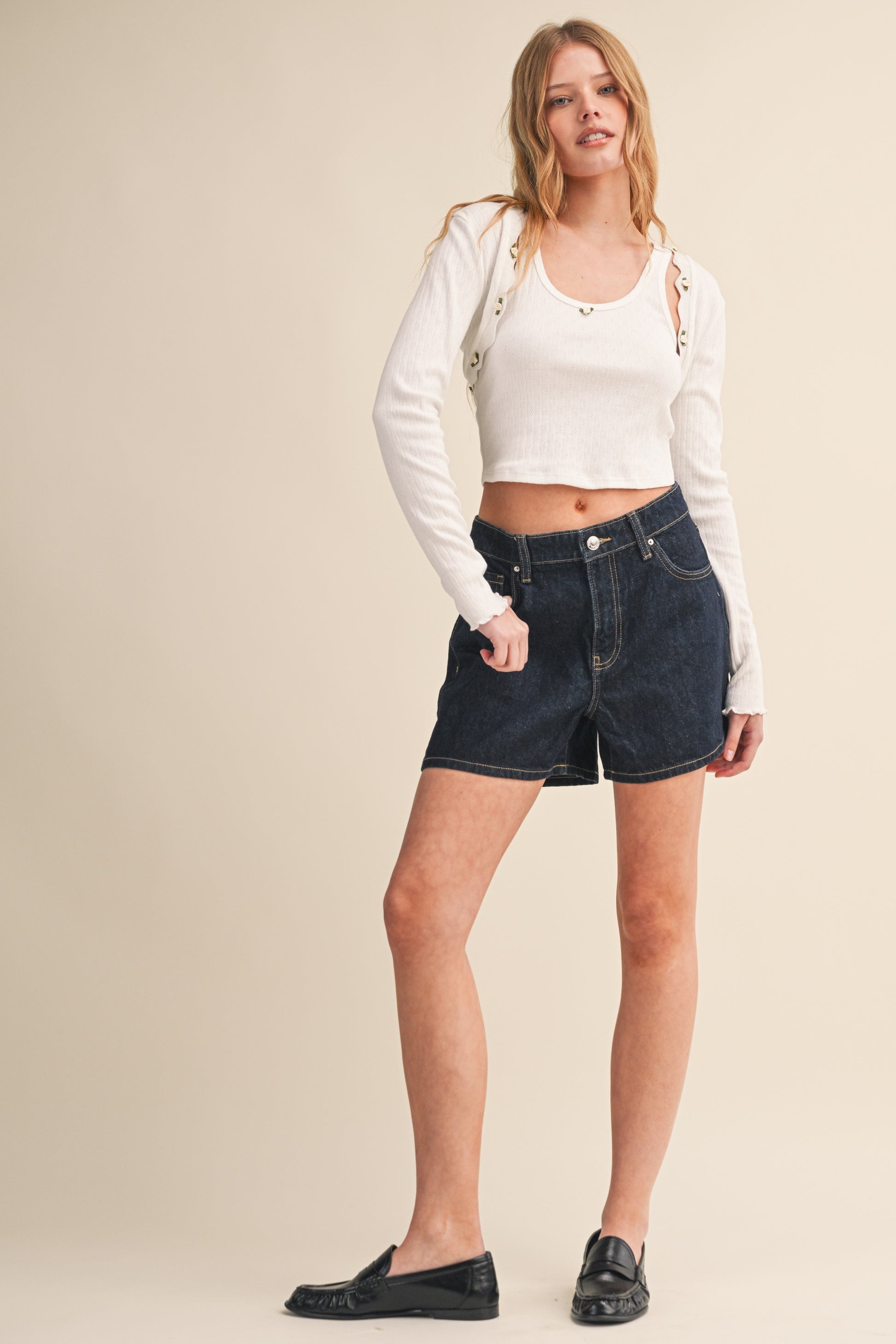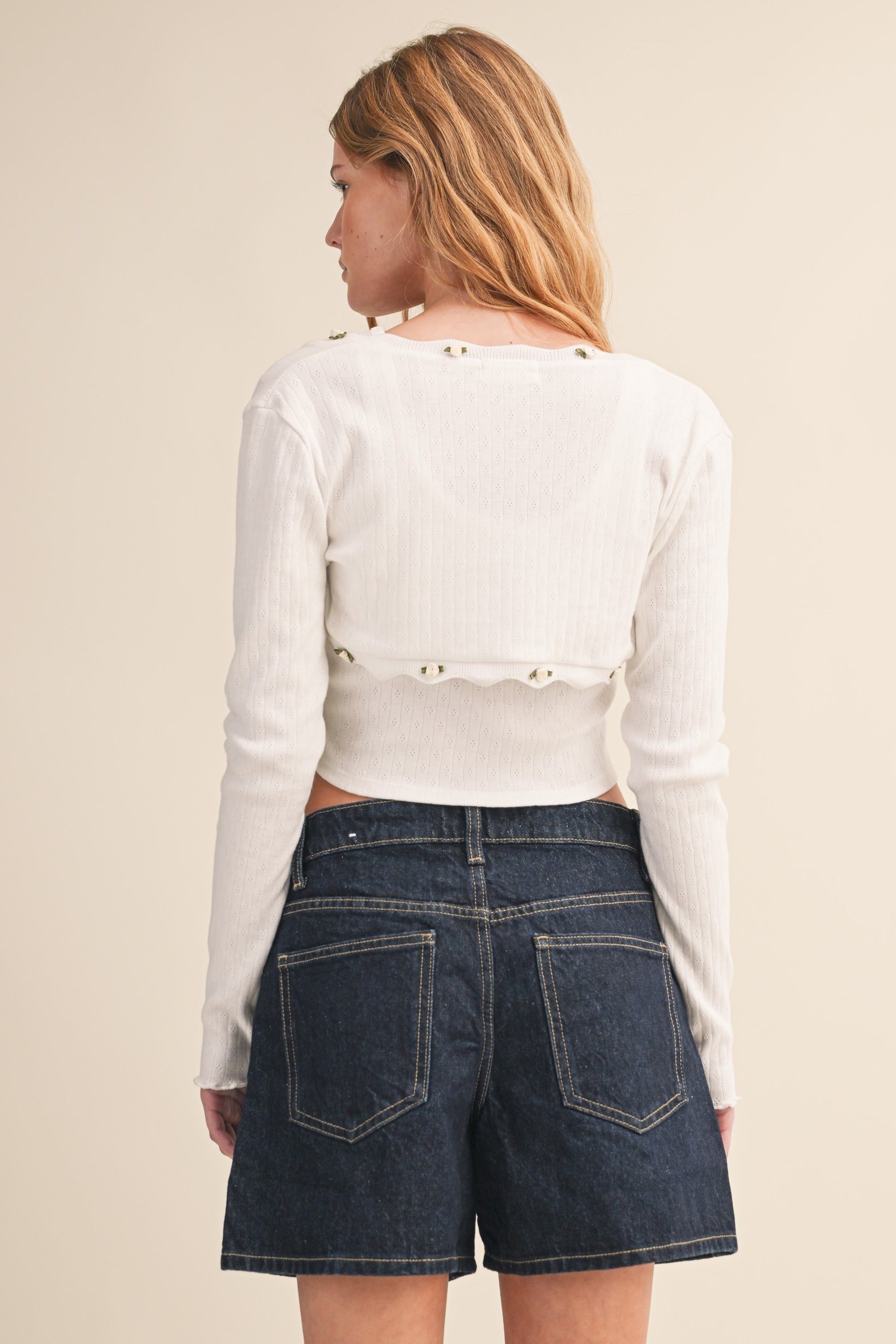 Delicate pointelle ribbed cami paired with a matching bolero featuring romantic rosette trim. Perfect for layering or wearing as a set, this piece combines texture and elegance for a versatile addition to any wardrobe.